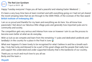With the semi-finals now underway, Becky will be competing alongside some of the most dedicated and talented licensees in the country for a place in the final this June. Whatever the outcome, reaching this stage is already an incredible achievement, and one that reflects not only Becky’s leadership, but the strength of the team and community around her. As Becky put it: