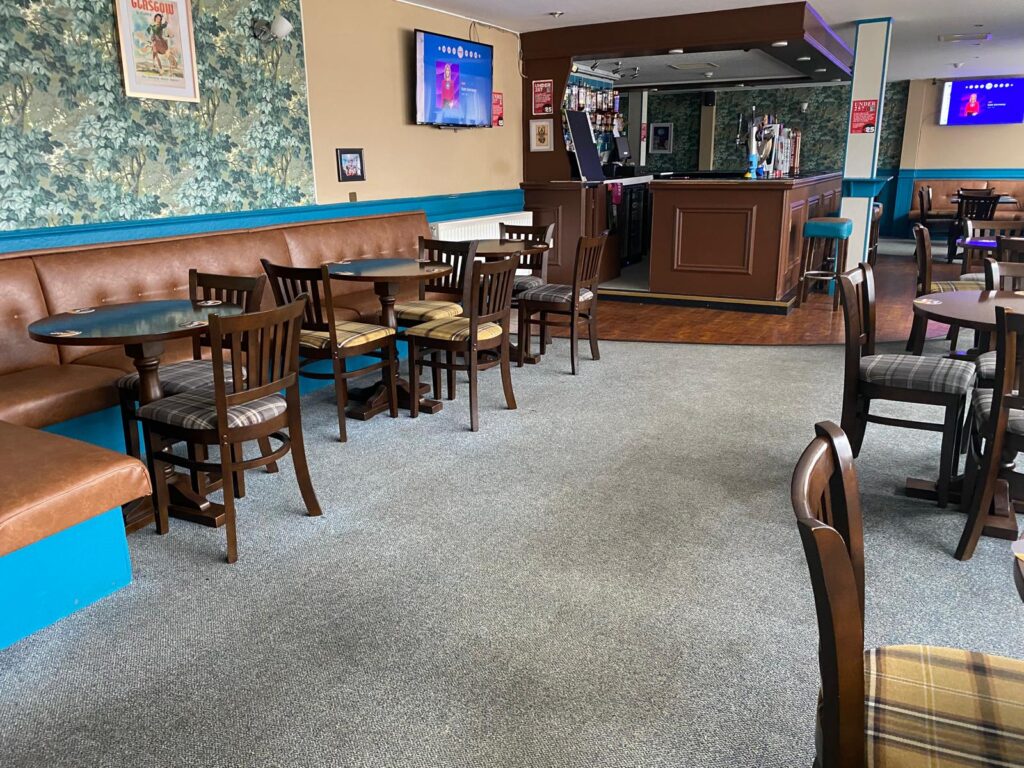 The Auld Cathkin operates across two main trading areas. Entrance through the main door leads directly into the bar area. Refurbished in 2023, this L-shaped space features a mix of low-level fixed bench seating, alongside loose tables and chairs, creating a comfortable and flexible layout. The interior combines painted and feature-papered walls with both carpeted and wooden flooring, complemented by high windows that allow plenty of natural light into the room. A prominent bar sits at the corner of the space, conveniently serving all areas and lined with high stools that enhance the traditional pub atmosphere. Just around the corner is a dedicated sports area, complete with a pool table and darts board, while televisions mounted on the walls show live sporting events, creating a lively social environment. A separate entrance leads to a large function room and lounge area, suitable for meetings, private events, and functions for up to 120 guests. This space is supported by a large catering kitchen, offering the potential to introduce catering or light food offerings. To the front of the pub, there is a small enclosed outdoor seating area with festoon lighting, overlooking the substantial car park located to the front and side of the building.