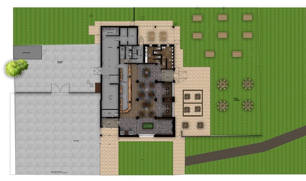 The pub will undergo a full internal and external transformation, creating a warm, modern, and welcoming space that caters to all. Inside, the open plan layout will be carefully zoned to provide distinct areas for different occasions. A dedicated sports area will feature a pool table, darts boards, and multiple large screens, complemented by new fixtures and fittings. The centrally positioned bar will serve as the heart of the pub, designed to efficiently service every part of the venue. Overlooking the bar will be a raised area with comfortable fixed seating and carpeted flooring, ideal for relaxed drinks and catch ups with friends, while the larger open space to the right will combine carpet and wooden flooring to create a versatile seating area suitable for all types of gatherings. Externally, the transformation will be just as impressive with plenty of space to to enjoy a drink with family and friends in the summer months, and further opportunity for community events like fun days and charity events utilising the great outdoor area.