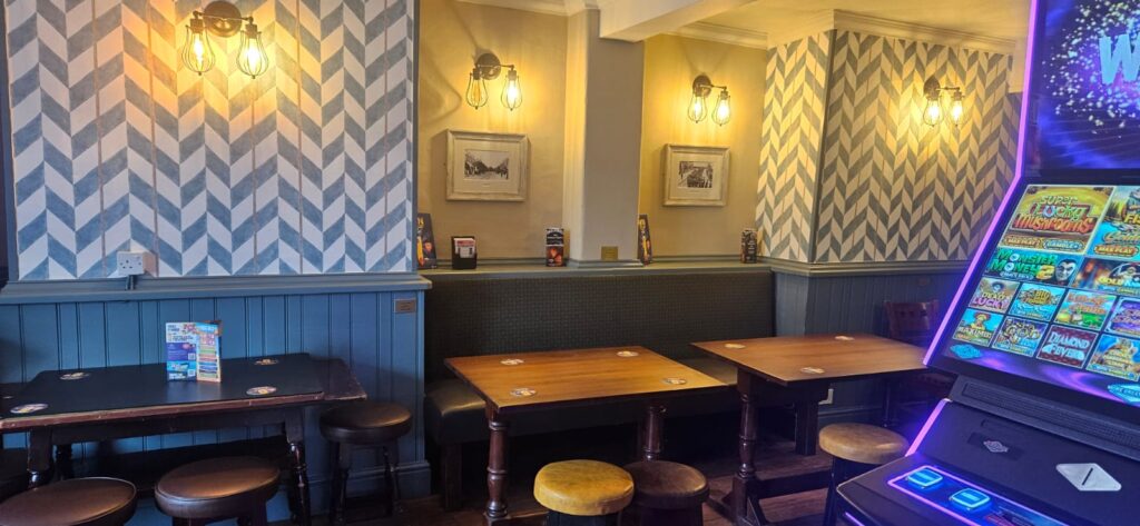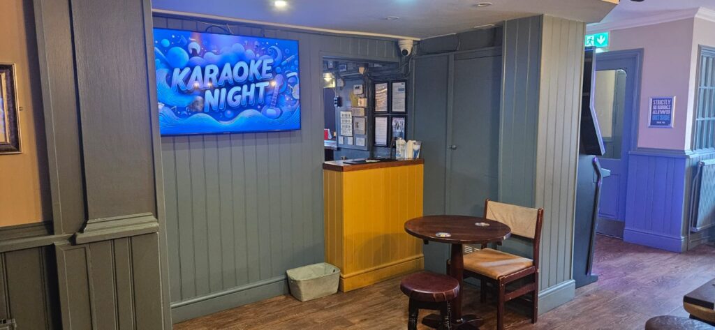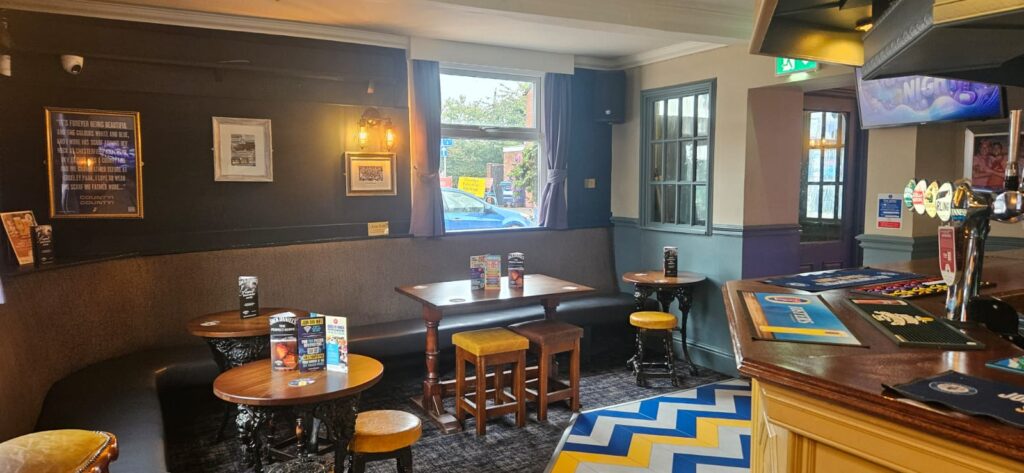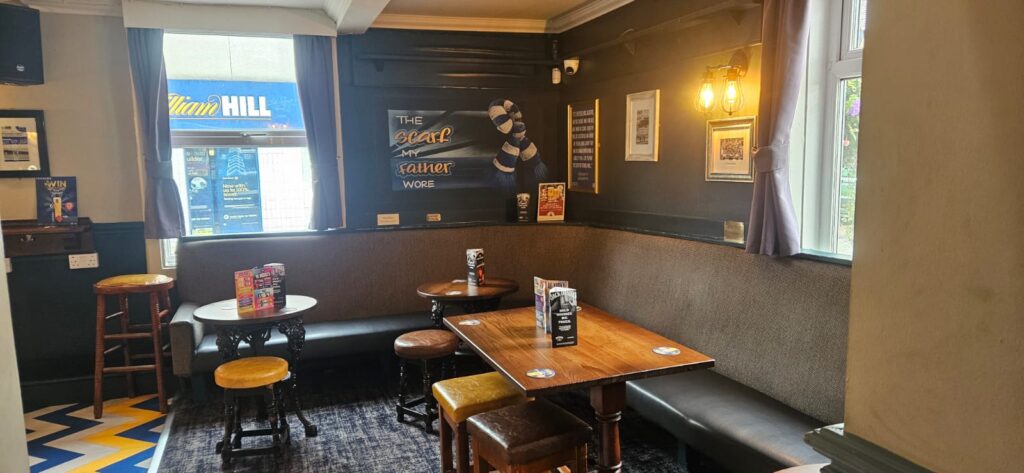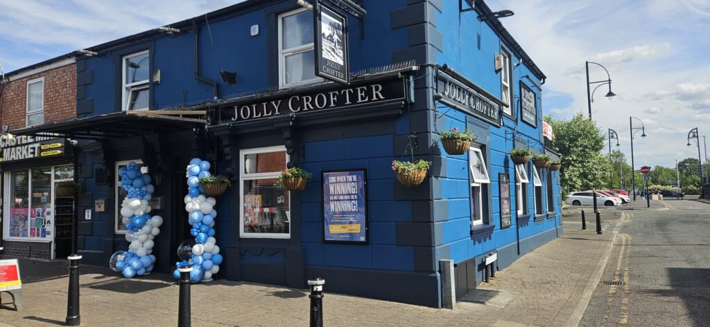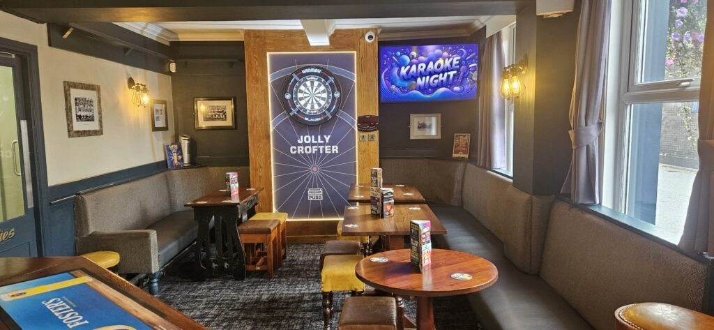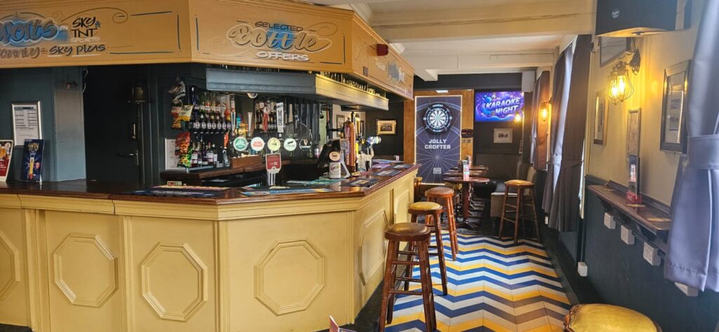 The “Crofter” is small and compact; but don’t let that fool you as it is busy from opening right through until close, and on match days the customers spill out on to the street. Situated at the head of the High Street, the Jolly Crofter serves as both the first and last call on the circuit for many locals. Upon entering, guests are greeted by a dynamic layout that caters to various interests and preferences. To the right of the entrance lies the bustling bar area, complete with state of the art dartboard and multiple TVs broadcasting live sports events. Customers can enjoy a refreshing drink while catching up on the latest matches or engaging in friendly competition on the dartboard. Tucked away in the corner is the karaoke area, loved by anyone who fancies a sing a long. The mix of loose and fixed seating ensures there’s space for everyone to relax and enjoy themselves. On the left side there is comfortable seating and an area which can be used for cribs and dominoes, the area provides the perfect setting for casual games and relaxed conversations among friends.