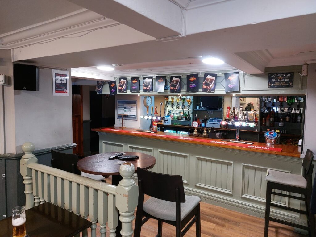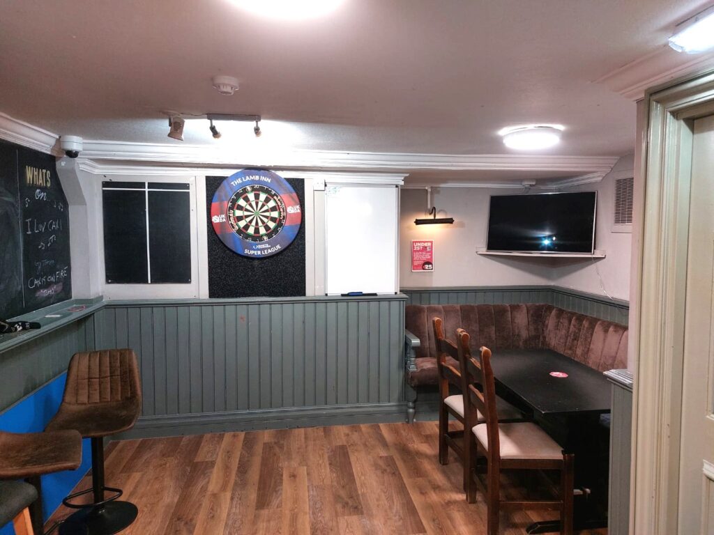 The Lamb Inn has recently undergone a comprehensive refurbishment, both inside and out. This recent renovation has transformed the pub, giving it a fresh and inviting appearance that promises a pleasant experience for all guests. Upon entry to the pub, you will be greeted by an open plan layout with one central servery. The pub is split into two distinct areas, comprising of both fixed and loose seating, with a darts area to the right hand side. To the rear of the bar you will find the kitchen, with both ladies and gents toilets to your left. At the side of the pub, there is a small hosting space, equipped with wooden benches to maximise curb appeal and to increase footfall on warmer days.