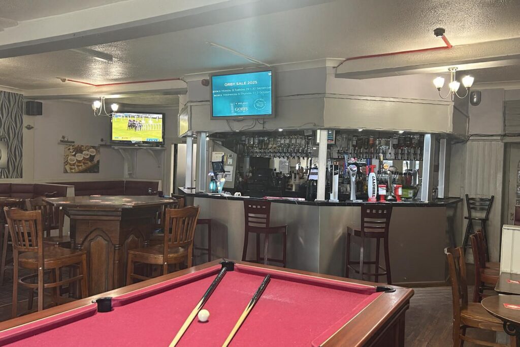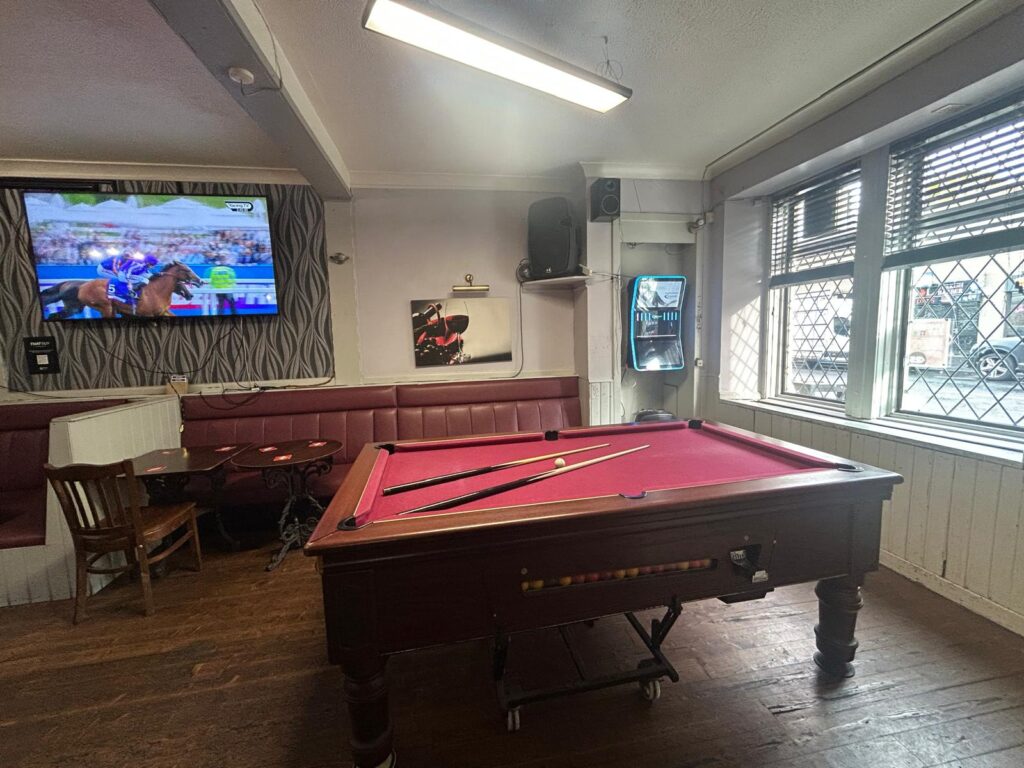 The bar is a cosy, single-room operation, with a prominent bar immediately visible upon entry. To the right of the entrance sits a pool table, providing a focal point for socialising and games. Two large windows overlooking the main street fill the space with natural light, enhancing the welcoming atmosphere. The wooden flooring complements the bench seating arranged in intimate snug sections, paired with low-level tables and chairs. High poser tables line the front of the bar, which is adorned with high stools, creating an authentic traditional “olde worldly” pub feel. TVs are positioned around the room, broadcasting live sports and racing. The toilets are conveniently located to the left of the bar.
