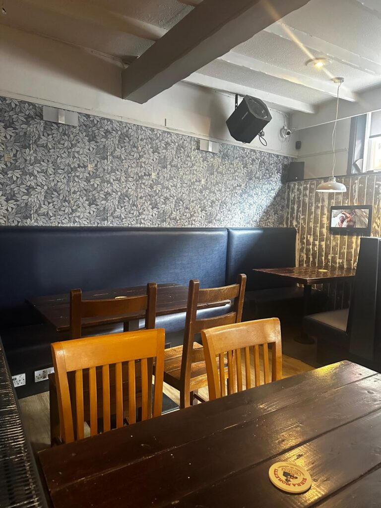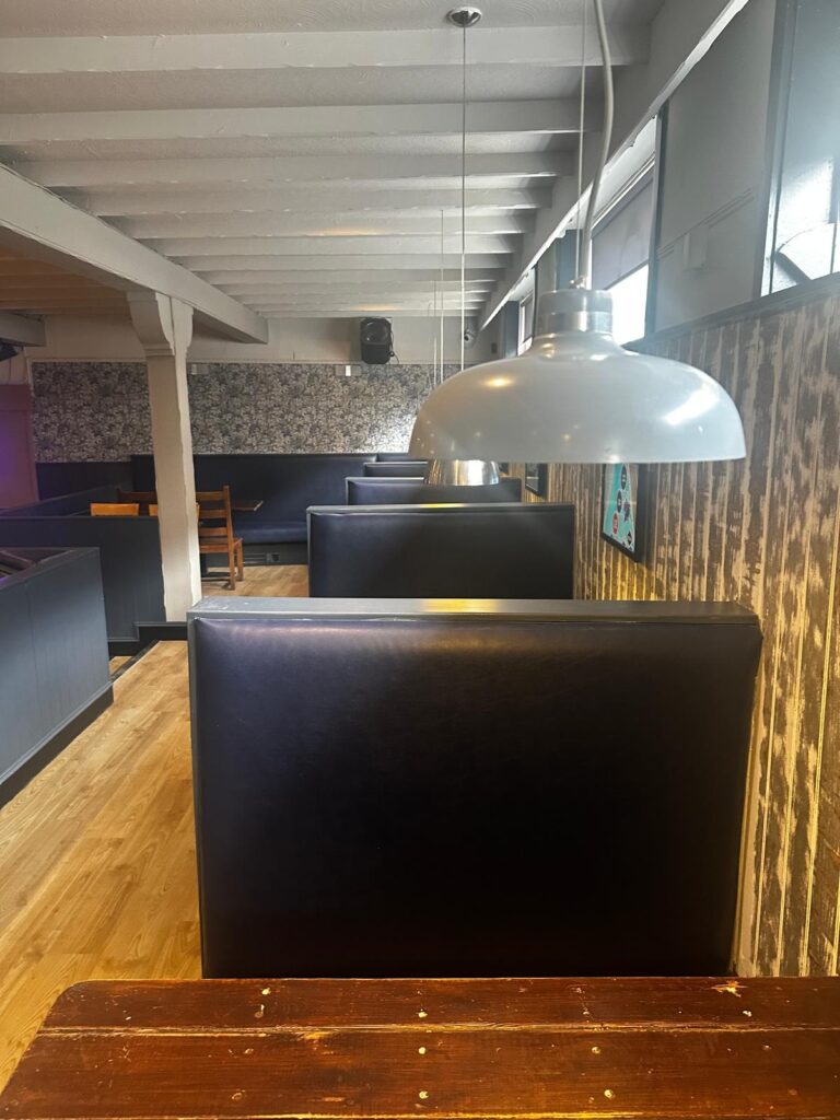 The trade area is a spacious, galley-style room with the bar positioned along the left-hand side, leading through to a small external drinking area that also includes space for darts. To the right of the entrance, a raised section provides booth seating for a more private or relaxed experience. Below this area, additional seating faces the bar, with a mix of high-level benches gradually transitioning to lower tables and chairs, creating a comfortable and flexible layout. Televisions are positioned throughout the room, showing live sports, with individual screens in the booth areas to enhance the viewing experience. The mix of booth seating, bar stools, soft lighting, and tall windows gives the space a warm and inviting feel, appealing to both diners and local drinkers. Externally, a small yard with fixed seating provides additional space for customers to enjoy drinks outdoors.