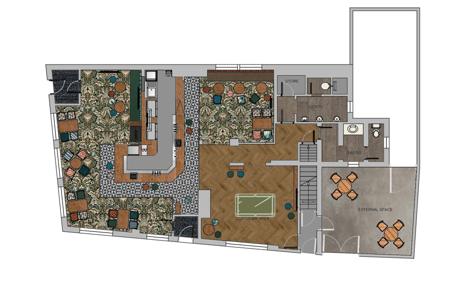The Wellington is set for an exciting transformation that keeps all the charm of a great local, whilst bringing in the features that matter most to the community. Inside, the open-plan layout is centred around a welcoming L-shaped bar, serving two main areas of the pub. As part of the refurbishment, we’re re-designing the seating plan to make the most of the space, adding a mix of comfy fixed and flexible loose seating so there’s room for everyone, whether you’re catching up over a pint or settling in to watch the match. Speaking of matches, sport will play a big role in the Wellington. A dedicated sports zone will be created, complete with a pool table, state of the art darts board and TVs throughout so you’ll never miss a moment of the action. We’re also giving the essentials some proper attention, upgrading the ladies and gents toilets for a fresh, clean feel. Outside, the small yard will be turned into a great little outdoor spot, with festoon lighting, new furniture and improved fencing to give it a welcoming, sociable feel, perfect for summer evenings. To top it all off, the exterior will be given a full refresh, with new signage and an updated colour palette to complement the tiling, boosting street presence and giving The Wellington the kerb appeal it deserves.